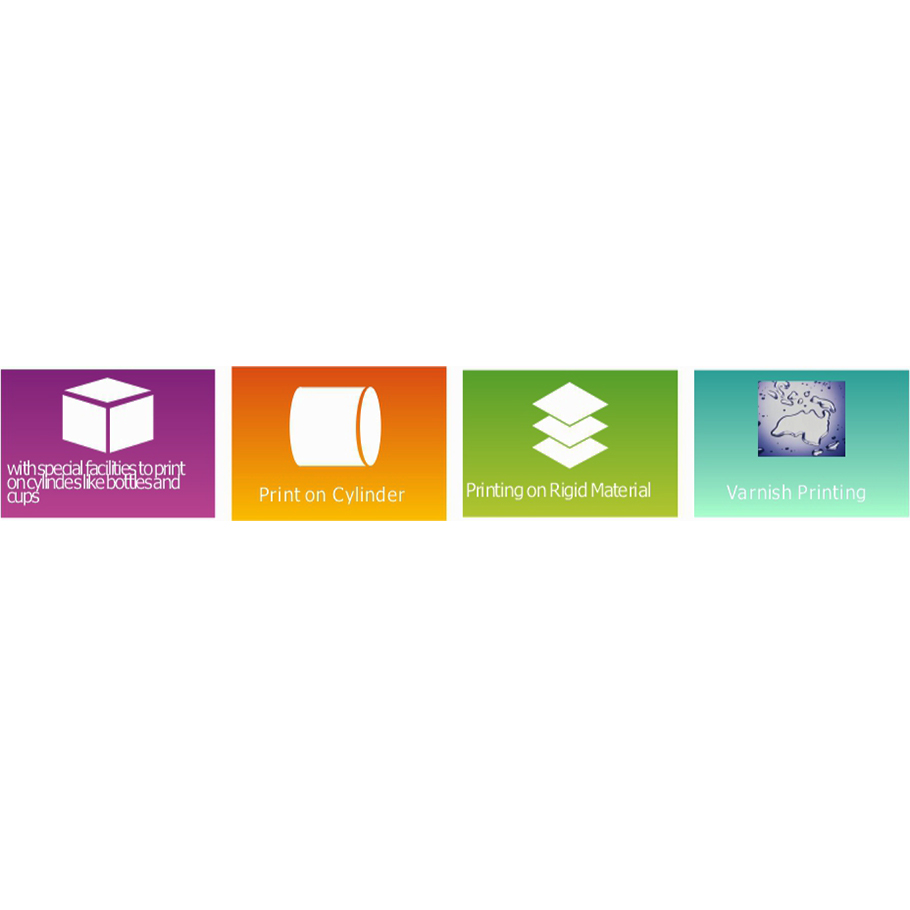 Enables simultaneous printing of White, Primary Colors, and Varnish, allowing for the creation of 3D effects and textured finishes on materials of varying colors.